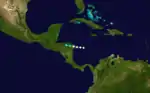 The steamship Gussie first encountered a hurricane with winds of 90 mph (150 km/h) early on October 31, while located about 95 miles (153 km) northeast of Providencia Island, Colombia.[3][2] The cyclone tracked westward and maintained its intensity as a strong Category 1 hurricane. Late on October 31, it made landfall in Nicaragua just south of Cabo Gracias a Dios. At 0000 UTC on November 1, the system weakened to a tropical storm. Six hours later, it was last noted over the Olancho Department of Honduras.[2] Impact from this system in Central America is unknown.[3]