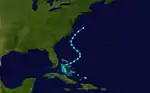A ship in the western Caribbean Sea reported a tropical storm on October 2.[10] The storm moved north-northwestward and entered the Gulf of Mexico early on the following day. Late on October 3, it peaked with maximum sustained winds of 60 mph (97 km/h). The storm re-curved eastward while situated over the northeastern Gulf of Mexico. At 0000 UTC on October 5, this system made landfall in modern-day Largo, Florida at the same intensity. Thereafter, the storm headed northeastward, until becoming extratropical early on October 6, while located offshore Georgia.[2]