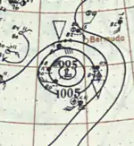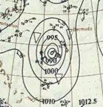 The hurricane turned northeastward on September 12 and began to accelerate. Early on September 13, it passed very close to Bermuda, with a minimum barometric pressure of 939 mbar (27.7 inHg) observed on the island.[2] Cedar trees were uprooted, while fruit and ornamental trees were swept out to sea. Some houses were destroyed, while others were deroofed. Severe damage was also reported at the naval yard and colonial government buildings. At Her Majesty's Dockyard alone, damage was "at least five figures".[10] Early on September 14, the storm weakened to a Category 2 hurricane, then to a Category 1 several hours later. Shortly after 0000 UTC on September 15, the hurricane struck the Avalon Peninsula of Newfoundland with winds of 85 mph (137 km/h). It soon became extratropical.[2] In Newfoundland, severe damage was reported at fishing premises.[10] The schooners Angler, Daisy, and Lily May either capsized or were driven ashore, resulting in 16 deaths.[11]