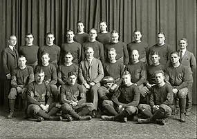 Several key players from the 1921 team were lost to graduation. These included halfback Eddie Usher, who played for the Green Bay Packers in 1922, and fullback Frank Steketee, who had been a first-team All-American as a freshman in 1918. Despite the loss of Usher and Steketee, the 1922 backfield was promising with Irwin Uteritz, Harry Kipke, Franklin Cappon, and Doug Roby all returning from the 1921 team. Michigan's biggest weakness going into the 1922 season was the center of its line. All-American center Ernie Vick graduated and joined the St. Louis Cardinals baseball team in June 1922.[3] Also gone were starting right guard, Hugh Wilson, and starting left guard, "Duke" Dunne.[4] The 1923 Michiganensian summed up the challenges facing the 1922 team, "When the football season of 1922 opened, Coach Yost was confronted with two big problems, to build a line strong enough to withstand the onslaught of opposing backs and to beat Ohio State."[5]