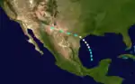After barometric pressures in the western Gulf of Mexico had been low for several days, the steamship Chester O. Swain encountered a disturbance of "probably moderate intensity" offshore Texas on June 28.[4] A tropical storm developed in the southwestern Gulf of Mexico on the previous day.[5] The storm was abnormally small, having a diameter of only about 20 mi (32 km).[4] It moderately intensified and by early on June 28, the storm became a hurricane. While offshore Texas, the hurricane peaked with winds of 90 mph (150 km/h). Shortly after making landfall near Matagorda Bay, a minimum barometric pressure of 982 mbar (29.0 inHg) was reported. The storm then accelerated westward across the Southwestern United States and weakened to a tropical storm early on June 29. However, it was still of "considerable intensity" while passing near El Paso about 24 hours later. Thus, the system was thought to have remained a tropical storm until early on June 30. Several hours later, the storm dissipated over Arizona.[5]
