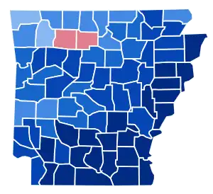 Throughout his first term as President, Roosevelt was extremely popular in the โSolid Southโ[10] and despite embryonic concerns over loss of Southern control of the national party due to abolition of the โtwo-thirdsโ rule[11] and some hostility to FDR's repeal of Prohibition[12] he was overwhelmingly and in many places almost unanimously supported by Arkansasโ limited electorate. Ozark Republican Landon did regain the two Unionist and Prohibitionist Ozark counties, but topped 40% in only two of the remaining seventy-three. Nonetheless, the 1936 results in Arkansas were about 10% less Democratic than that of 1932, despite the nation as a whole shifting somewhat to the left. As of 2020, this remains the last time that a presidential candidate has won more than 80% of the vote in Arkansas.