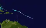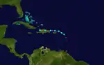 A strong tropical storm with peak winds of 70 mph (110 km/h) was first identified just west of Antigua and Barbuda at 06:00 UTC on August 8,[6] though it may have developed days earlier in the absence of a reliable data network. The rapidly-moving system curved west, passing north of Puerto Rico before striking the northeastern coastline of the Dominican Republic as a 50 mph (80 km/h) cyclone at 09:00 UTC on August 9.[5] The storm continued across Hispaniola and dissipated after 18:00 UTC that day, though the remnant tropical wave continued on to impact Cuba on August 10.[5][6]