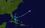 A tropical wave moved off the western coast of Africa around September 4 and moved westward,[5] spawning a tropical depression about 910 miles (1,460 km) east of Barbados by 12:00 UTC on September 9. The newly formed cyclone tracked west-northwest and maintained tropical depression intensity for several days. By 00:00 UTC on September 13,[6] data from nearby ships was sufficient to upgrade it to a tropical storm with peak winds of 40 mph (64 km/h). The system curved poleward and weakened while interacting with a broad trough or area of low pressure. Its final point has been analyzed a few hundred miles north of Puerto Rico after 00:00 UTC on September 14.[5][6] This system was discovered the during the Atlantic reanalysis project in 2012.[5]
