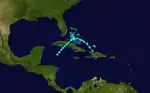 Around 00:00 UTC on August 10,[6] a rapidly-moving tropical storm was identified southeast of Barbados.[5] It tracked into the Caribbean Sea and intensified into the season's second hurricane, with the center of the storm narrowly missing Jamaica to the north late on August 11. Observations from Grand Cayman indicate that it strengthened into a Category 2 hurricane,[5] reaching peak winds of 100 mph (160 km/h) that day, before the system slowly weakened. It moved through the Yucatán Channel and into the Gulf of Mexico, making a later landfall just west of Cameron, Louisiana, at 01:00 UTC on August 15 with winds of 75 mph (121 km/h). The cyclone curved north-northeast and was last observed as a weak tropical depression along the Arkansas–Louisiana border at 12:00 UTC on August 15.[6]