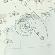 A tropical wave ascended to tropical storm status by 06:00 UTC on September 28 while located about 230 mi (370 km) south of Bermuda.[7] It moved northwest and then west-northwest, steadily organizing to attain peak winds of 65 mph (100 km/h) early on September 30. The storm then moved ashore the central coast of Maryland and was last distinguishable near Williamsport, Pennsylvania, around 00:00 UTC on October 2.[8] Considerable damage to crops, and lesser damage to structures, was inflicted throughout the Norfolk and Cape Charles, Virginia, areas, with damage estimated at $20,000.[10] Rainfall was generally light, peaking at 4.6 in (117 mm) in Diamond Springs,[9] but did result in some street flooding. A small ship and several small boats were sunk. Atlantic City, New Jersey, reported a maximum gust of 70 mph (113 km/h), and only slightly weaker gusts were recorded throughout Virginia. One death was reported.[10]