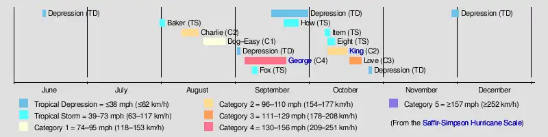 The first tropical cyclone of the season, a tropical depression, existed from June 13 to June 14. However, activity went dormant for over a month and a half. On July 31, Baker developed in the Gulf of Mexico. In August, two tropical storms developed – Charlie and Dog–Easy. September featured five tropical cyclones, including Fox, George, and How, as well as two tropical depressions.[2] George, more commonly known as the Fort Lauderdale hurricane, was the most intense tropical cyclone of the season, peaking as a Category 4 hurricane with maximum sustained winds of 145 mph (230 km/h) and a minimum barometric pressure of 938 mbar (27.7 inHg). October also had five tropical cyclone, including Item, King, Love, an unnamed storm, and a tropical depression. With four tropical storms, this was the most in the month of October since 1933. The season's final tropical cyclone, a depression, developed on November 28 and was absorbed by a cold front on December 1.[2]