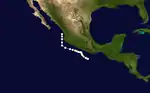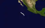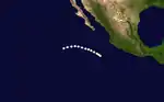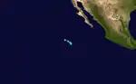 The final tropical cyclone of the season was initially discovered 539 mi (867.43 km) southwest of Zihuatanejo, Mexico. Hurricane Seven initially headed northward, but curved northwestward later that day. No change in intensity occurred, and Hurricane Seven dissipated on October 3, 142 mi (228.52 km) southwest of Socorro Island.[2]