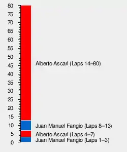 Fangio was the initial race leader, having started from pole position, but he soon had to cede the position to Ascari. He retook the lead on lap eight before pitting for a tyre change, which dropped him to fifth. Early retirements for Farina and de Graffenried left José Froilán González in second, behind his teammate Ascari. Fangio attempted to bridge the gap to the Ferraris, but engine problems eliminated his chances. The sole remaining Alfa driver, Nino Farina, who had taken over Bonetto's car on lap 30, inherited third place as a result of Fangio's retirement. He was fast, but fuel leakages meant that he needed to make two further pitstops; he therefore had to settle for third. Alberto Ascari took his second, and Ferrari's third, consecutive Championship race victory, ahead of British Grand Prix winner González. The other works Ferraris of Villoresi and Taruffi completed the points positions in what was another successful race for the Scuderia.[3]
