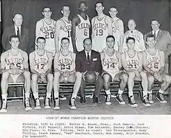 The 1956–57 Boston Celtics season was the 11th season for the franchise in the National Basketball Association (NBA). This was the first time in franchise history where the Celtics advanced to the NBA Finals, which they won over the St. Louis Hawks in 7 games. The Celtics would make the Finals a record 10 consecutive seasons, spanning from this season to the 1965–66 season. They were led by 1957's MVP Bob Cousy, as well as Bill Russell, Bill Sharman, and 1957's Rookie of the Year Tom Heinsohn.