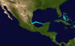 A westward-moving tropical wave traversed the Lesser Antilles on July 20. It moved across the Caribbean, and its thunderstorms increased on July 23 while passing south of Cuba and beneath a high-pressure area. There is evidence that it could have developed a circulation on July 24 before it struck the Yucatán Peninsula. It is confirmed to have developed into a tropical depression on July 25 in the Bay of Campeche. As it continued west-northwestward, it rapidly intensified into Tropical Storm Anna, and before moving ashore in Mexico near Ozuluama, Veracruz, on July 26 it attained hurricane status. Peak winds reached 85 mph (135 km/h), although Anna rapidly dissipated on July 27 as it moved further inland.[3] The high winds wrecked several homes in poor regions of Tampico, Tamaulipas, while rainfall of 2.5 in (64 mm) resulted in flooding.[5] The high winds severed telegraph lines from Tampico to San Luis Potosí. The same area was affected by several hurricanes in the previous year.[13] Damage totaled around $50,000, and there were no deaths.[5]
