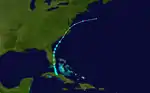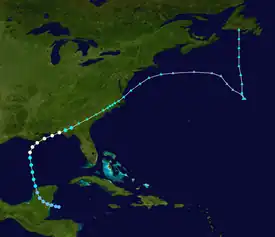 A low-pressure area formed along a dissipating cold front to the north of Puerto Rico. The system moved westward, developing some tropical characteristics by October 13.[5] The next day, the system became a tropical storm over the Straits of Florida.[3] On October 15, it crossed over South Florida near Homestead with winds of 60 mph (95 km/h). The storm was never fully tropical, as its winds and precipitation extended far away from the center.[5] The storm intensified further over the Florida peninsula, peaking at 65 mph (105 km/h) early on October 16.[3] After affecting Florida, the storm crossed the western Atlantic and moved across the Outer Banks.[5] The storm became extratropical on October 17, and the next day it was absorbed by another extratropical storm.[20]