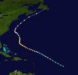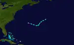 While situated about 300 mi (485 km) east of Bermuda on July 31, it began heading northeastward. Later that day, the depression finally organized further and developed a well-defined rainband. The Atlantic hurricane database indicates that the depression strengthened into a tropical storm at 18:00 UTC on July 31, due to ships reports of winds reaching 46 mph (74 km/h).[11][3] On August 1, it intensified further into a hurricane. Around that time, maximum sustained winds peaked at 85 mph (137 km/h).[3] The storm continued moving rapidly northeastward and began to interact with a cold front.[11] It transitioned into an extratropical cyclone on August 2, while located about 525 mi (845 km) east of Cape Race, Newfoundland.[3]