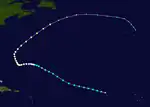 TIROS observed a large cloud mass near 18°N, 37°W on September 4.[29] It developed into a tropical depression early that day while located about 665 mi (1,070 km) east of Cape Verde. The depression moved west-northwestward and intensified into Tropical Storm Ethel at 18:00 UTC on September 4.[3] Initially, it was suggested that Hurricane Dora could absorb Ethel, as the storms were located 690 mi (1,110 km) apart.[29] On September 7, Ethel strengthened into a hurricane. By early on the following day, it curved westward and continued to slowly deepen, before turning to the north-northwestward on September 11.[3]
