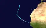 A tropical wave emerged into the Atlantic Ocean from the west coast of Africa on September 5.[8]: 183 The wave quickly developed into a tropical depression at 06:00 UTC on September 5, while located about 40 mi (64 km) west of Dakar, Senegal.[3] Shortly later, the depression produced squally weather in Cape Verde.[8]: 183 The depression then re-curved northwestward and began to intensify. At 00:00 UTC on September 7, the depression strengthened into Tropical Storm Florence. About twenty four hours later, the storm attained its maximum sustained wind speed of 45 mph (72 km/h). Florence then curved north-northeastward later that day and slowly weakened.[3] A reconnaissance aircraft reported that Florence degenerated into an area of squalls to the south of the Azores at 06:00 UTC on September 10.[3][8]: 183
