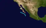 The last tropical cyclone of the season, Tropical Storm Tillie, developed on September 7. At first, the cyclone moved north-northwest;[3] Tillie reached its peak intensity of 60 mph (95 km/h) at that time of its formation approximately 150 mi (240 km) west of Mazatlan.[5] Early on September 8, while located about 100 mi (160 km) southwest of Cabo San Lucas, Tillie began a gradual turn towards the west-northwest. Tropical Storm Tillie dissipated at 0600 UTC on September 9[3] off the coast of California,[9] having only been a tropical cyclone for just over two days.[3]