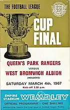 The 1967 Football League Cup Final was an association football match between Queens Park Rangers (QPR) and West Bromwich Albion on 4 March 1967 at Wembley Stadium, London. It was the final match of the 1966–67 Football League Cup, the seventh season of the Football League Cup, a football competition for the teams in The Football League. This was the first final to be decided over a single game; the six previous finals were contested over two legs. QPR were appearing in their first final, while Albion were appearing in their second after winning the previous final in 1966.
