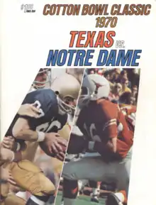 The 1970 Cotton Bowl Classic[2] was a postseason college football bowl game in the 1969 season, held at the Cotton Bowl in Dallas, Texas, on Thursday, January 1, 1970. The game matched the top-ranked Texas Longhorns (10–0) and the #9 Notre Dame Fighting Irish (8–1–1).[3][4]
