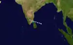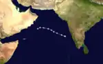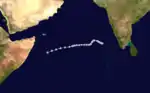 The remnant low of a depression emerged into the Arabian Sea off Kerala late on November 21, and developed into a new depression on the next day, as it moved westward. The depression moved further west, and gradually turned toward the southwest, intensifying as it did so. It became a cyclonic storm on November 28, to the southeast of Socotra, and reached its peak intensity with winds of 75 km/h (45 mph) soon after. The cyclone continued to move west-southwestward, and rapidly weakened into a remnant low-pressure area off the Somalia coast on the next day, ending the season.[2] The cyclone brought widespread rain to the Laccadives from November 22 to 24, with 60 mm (2.4 in) recorded on Amini on November 23.[2]