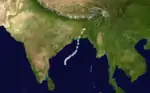 A low-pressure area developed in the northern Bay of Bengal on June 6 and developed into a depression on the next day, as it drifted to the north, moving over the south of the Ganges Delta. The depression reversed its course overland, reemerging into the Bay of Bengal on June 8. Once over open water, the depression intensified into a cyclonic storm on the morning of June 9. The cyclone's motion shifted to the northwest and it made a second landfall near Balasore in northern Orissa that night. The cyclone quickly weakened to a deep depression overland and tracked to the west over central India, where it degenerated into a broad area of low pressure on June 11.[2] Sustained winds of 65 km/h (40 mph) were recorded at Sandheads on June 9, while the cyclone was at its peak offshore. High levels of rain affected much of Orissa and West Bengal, with over 100 mm (3.9 in) falling over large areas of both states. As the storm dissipated overland, it brought severe rain to Vidarbha and southern Madhya Pradesh. The highest recorded rainfall was at Khandwa were 280 mm (11 in) fell on June 13 alone. The rains led to localised flooding in parts of Vidarbha and disrupted road transport in the region.[2]