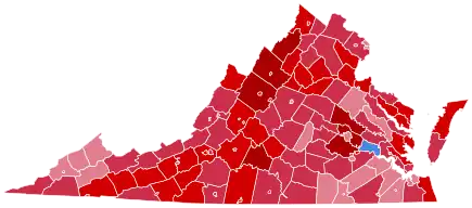In strict accordance with national trends, McGovern carried just one county or independent city in Virginia — however, that jurisdiction, Charles City County, saw McGovern receive over 67 percent of the vote, and was his fourth-strongest county in the country.[15] As of the 2020 presidential election, this constitutes the last occasion the Republican Party has carried Brunswick County, Greensville County, Surry County, Sussex County, and the cities of Charlottesville, Norfolk, Petersburg, Portsmouth and Richmond.[16] It is also the last occasion Virginia voted to the right of Wyoming.