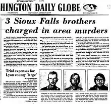 The perpetrators of this slaying were brothers Allen Fryer (male, 29), David Fryer (male, 24), and James Fryer (male 21) of Sioux Falls, South Dakota.[3]