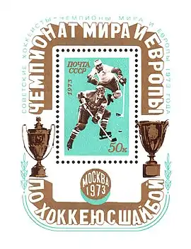 ![]() A Soviet stamp sheet dedicated to the 1973 World Ice Hockey Championships | |