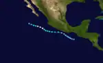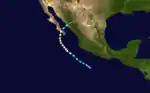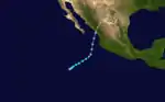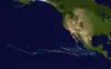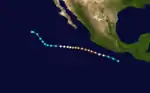 Katherine became a tropical storm on September 29, just six hours after forming. It headed out to sea. On October 1, it became a Category 2 hurricane. It peaked in windspeed the next day. After weakening to storm strength, it crossed 140°W and entered the central Pacific.[2] Katherine continued its slightly south of westward track. It dropped to a depression on October 9, and dissipated shortly after that due to the influence of a cold trough[2][7]