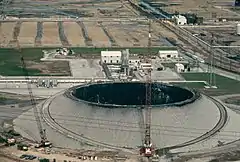 The particular gas tank that exploded had a capacity of 660,000 barrels,[4][5] and was 108 feet (33 m) tall[4] with a diameter of 272 feet (83 m).[6] The tank was owned by Texas Eastern Transmission Pipeline (TETCo) and had supposedly been drained in April 1972.[2]: 28 However, the tank had a polyurethane lining, which enabled gas to be trapped inside the lining even after the liquid had been drained.[7] At the time of the explosion, the men were sealing cracks in the plastic lining of the tank.[8][9] The roof of the tank was designed to collapse in the event of an explosion.[5] TETCo officials had been "fanatical about safety",[4] and even on the day before the explosion, February 9, 1973, TETCo officials called Staten Island residents "hysterical" for raising concerns about the danger of storing gas near residential areas.[2]: 26