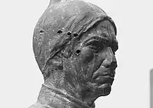 A bust of Crisanto Salazar, the first chancellor of UES, with bullet holes massacre still present