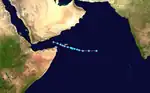 On June 9, a tropical disturbance was noted off the west coast of India in the Arabian Sea. The system moved northward, followed by a northwest turn on June 10 while the system intensified into a tropical storm. It curved toward the west, and the JTWC reported the cyclone as reaching peak winds of 70 mph (110 km/h) on June 11. The JTWC issued the final advisory at 0800 UTC on June 13 as the storm was making landfall on Masirah Island.[3] The Oman Department of Meteorology reported the storm as being much stronger than the JTWC, with sustained winds of 105 mph (170 km/h) with gusts to 140 mph (230 km/h).[4] Shortly after striking Masirah, the storm moved ashore mainland Oman, causing rapid weakening to tropical depression status. The system dissipated on June 14 after crossing into southeastern Saudi Arabia.[3]