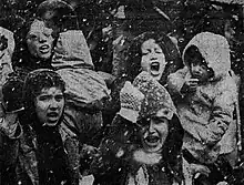 Male supporters formed human chains on both sides of the women protesters marchers to shield them.[8][7] However, the chain were broken up on several occasions, and some protesters were attacked.[8] The women protestors were attacked at the streets by mobs of counter-protestors with knives, stones, bricks, and broken glass.[7] Both male bystanders as well as veiled women in chadors shouted epithets to the protesters.[8]