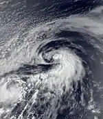 In late September, a cold-core low persisted off the coast of Portugal, moving southwestward. The system gradually developed tropical characteristics as it turned northwestward and executed a loop near the Azores. Eventually, the system organized enough to be designated as a tropical depression on October 4, while just east of the Azores. Shortly thereafter, the depression intensified into Tropical Storm Ivan.[43] However, the National Hurricane Center did not initiate advisories on Ivan until late on October 5.[44] Ivan moved largely in tandem with the upper-level low above it, while its southwest movement was caused by a building ridge to its north.[43] Late on October 5, an eye developed,[45] and Ivan was upgraded to a hurricane on the following day.[43]
