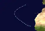 On August 28, a tropical wave emerged into the Atlantic off the west coast of Africa. At 00:00 UTC on September 1, the system developed into Tropical Depression Seven, while centered roughly midway between the Lesser Antilles and the west coast of Africa.[25] Sixteen hours later, the National Hurricane Center initiated advisories on the depression.[26] The depression tracked westward in the trade winds during the following three days, without any intensification. After curving northwestward an Air Force reconnaissance flight found little evidence of a closed circulation, while satellite imagery also showed a disorganized and elongated cloud pattern on September 4.[25] As a result, it was determined that the depression degenerated into a tropical disturbance at 06:00 UTC on that day.[27] However, the National Hurricane Center did not discontinue advisories until 22:00 UTC.[28]