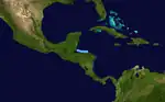 A tropical wave exited the west coast of Africa on September 11 and tracked westward with minimal development until reaching the Caribbean Sea. By September 20, a low-level circulation had developed and the system was then classified as Tropical Depression Eleven, while located almost midway between Panama and Jamaica. While heading almost due westward, the depression steadily intensified, becoming Tropical Storm Hermine on September 21, 18 hours after forming. Later on September 21, the storm passed only 5 mi (10 km) offshore of Honduras. Hermine curved west-northwestward and nearly strengthened into a hurricane before landfall in northern British Honduras (present-day Belize) on September 22. After crossing the Yucatán Peninsula, Hermine emerged into the Bay of Campeche on the following day.[40]