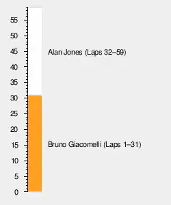 Giacomelli continued to set an even pace, and his lead was ten seconds on lap 21, with Reutemann now threatening Piquet, whose tires were beginning to go off. Jones had caught up to de Angelis, and on the next lap, got around him for fifth.