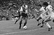 Action from the preseason game against Feyenoord; Johan Cruyff at centre.