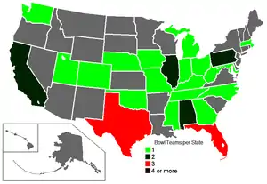![]() Number of bowl games per state. | |||||||||||||||||||||||||||||||||||||||||||||||||