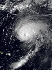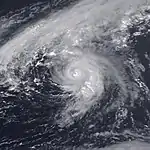 The tenth tropical depression of the season developed from a tropical wave on August 30. The depression quickly intensified into Tropical Storm Gabrielle on the following day. Gabrielle moved generally westward, but curved slightly west-northwestward after intensifying into a hurricane on September 1. Further intensification continued, and Gabrielle eventually peaked as a very strong Category 4 hurricane on September 5. After peaking with sustained winds of 145 mph (235 km/h), Gabrielle slowly curved nearly due north.[39] Gabrielle significantly weakened while heading northward, with sustained winds dropping from a high-end Category 4 hurricane to a strong Category 3 hurricane within 12 hours on September 7. While weakening as it headed northward, Gabrielle bypassed the island of Bermuda early on September 8.[40]