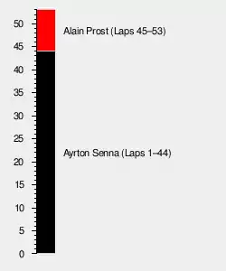 As the grid was in the process of forming up before the start, the McLaren team transferred the settings from Senna's car to Prost's in the hope of curing its handling problem (Prost had actually been more than 2 seconds slower in the race morning warm up than Senna). Prost would later say that while handling and grip were significantly improved, the down on power engine remained and despite the same wing settings he still could not match his teammate for straight line speed.[4]