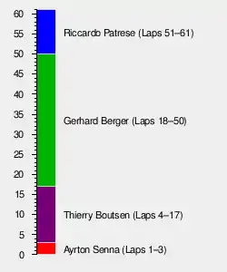 Mansell's demise left Berger ahead of Patrese, who went through into the lead on lap 51. Nannini and Prost battled over third place, with Nannini winning out. Patrese duly won his first race since the 1983 South African Grand Prix, leading home Berger, Nannini, Prost, Piquet, and Alesi. With 98 races between victories, Patrese claimed the record for most starts between wins - a record that would be taken 28 years later by Kimi Räikkönen, who started 113 races between winning the 2013 Australian Grand Prix and the 2018 United States Grand Prix.