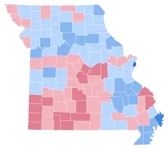 As of the 2020 presidential election, this was the last time in which Missouri voted Democratic (although it almost did so in 2008 for Barack Obama) as well as the last time that Hickory County, Benton County, Mercer County, Caldwell County, Grundy County, Crawford County, Carroll County, Franklin County, St. Clair County, Livingston County, DeKalb County, Lafayette County, St. Francois County, Daviess County, Bates County, Madison County, Montgomery County, Sullivan County, Clark County, Nodaway County, Henry County, Vernon County, Gentry County, Macon County, Knox County, Wayne County, Ripley County, Clinton County, Monroe County, Ralls County, Randolph County, Dunklin County, Reynolds County, Oregon County, Howard County, Shannon County, Shelby County, Callaway County, Scott County, Lincoln County, Audrain County, Pike County, Marion County, Lewis County, Scotland County, Schuyler County, Chariton County, Worth County, and Linn County voted for a Democratic presidential candidate.[2]