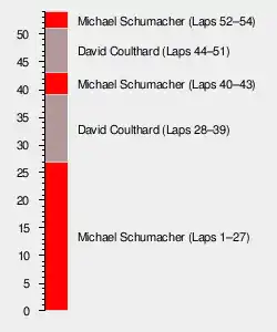 On the front row, Michael Schumacher established a gap around ten seconds to David Coulthard until his first stop. Then the McLaren driver took the lead until his only stop, dropping again to second, and coming back to the field around eight seconds behind the German. As the Ferrari driver needed a second stop to refueling, the lead would came back to Coulthard on lap 44. Schumacher exited the pit behind Olivier Panis and soon lapped the Frenchman, seventh at the time. However the German struggled on his new set of tyres and was unlapped by Panis, giving an even more comfortable lead to Coulthard.