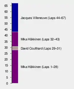 At the start Häkkinen led away while teammate Coulthard jumped from sixth to second, ahead of Villeneuve.