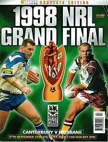 The 1998 NRL Grand Final (also known as the 1998 Sydney SportsTAB NRL Grand Final due to sponsorship) was the conclusive and premiership-deciding game of the 1998 NRL season. It was the first grand final of the re-unified National Rugby League and featured minor premiers and the previous year's Super League premiers, the Brisbane Broncos against the Canterbury-Bankstown Bulldogs, who had finished the regular season ninth (out of 20) to make a top-ten play-off grouping. It was to be the first grand final under the National Rugby League partnership's administration and the last to be played at the Sydney Football Stadium.[1] It was also the first time these two sides had met in a grand final.