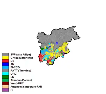 The South Tyrolean People's Party (SVP) and the Daisy Civic List (Civica) resulted the two most voted parties at the regional level. The SVP retained its outright majority in South Tyrol, while the Civica became the largest party in Trentino. After the election, the two parties formed a coalition at the regional level. Luis Durnwalder (SVP) and Lorenzo Dellai (Civica) were sworn in at the head of the two Provinces, respectively, while the Democrats of the Left and the Trentino Tyrolean Autonomist Party shared the Regional administration.