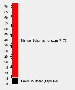 Heidfeld was overtaken by de la Rosa for 13th on lap three, while Gené passed Fisichella for 17th position. On the next lap, Coulthard's lead to Michael Schumacher was reduced by one second. de la Rosa continued moving up the field by passing Wurz for twelfth. On the same lap, Alesi became the first driver to pit for dry tyres. Michael Schumacher began attacking Coulthard for the lead on lap five with the McLaren driver moving to defend his position. On lap six, Barrichello became the first of the frontrunners to pit, while Irvine lost eleventh position to de la Rosa. Häkkinen led several cars in the pit lane to change to dry tyres on lap seven, while Ralf Schumacher, Zonta, Verstappen, Irvine and Wurz. Coulthard took his penalty on lap eight and dropped from second to sixth.[28][29] Fisichella made a pit stop to serve his identical penalty on the same lap, from twenty-second position and remained in that position.[29] Michael Schumacher, Frentzen, Diniz and Mazzacane were the only drivers not to change tyres by lap 9,[29] while Coulthard made a pit stop and rejoined in 16th.[28]