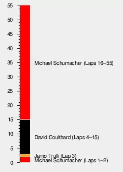 During the safety car period, several drivers made pit stops for rain tyres. Although he had no radio communication with his team, Coulthard exited the pit lane leading while Ferrari had a fraught stop.[48] After Ferrari technical director Ross Brawn called both Michael Schumacher and his teammate Barrichello for their first pit stops,[48] Schumacher sat behind Barrichello for 1 minute and 12 seconds because the team was missing Barrichello's front-right wheel and debris had to be removed from his sidepods. The duo emerged in 10th and 11th. Rain stopped falling by lap seven although there was a large amount of standing water as the safety car remained on track for the next three laps.[47][50] Coulthard led from Frentzen and Verstappen at the lap-11 restart.[42] He began to pull away from the rest of the field as Verstappen slipstreamed Frentzen on the back straight and out-braked him for second at the turn 15 hairpin.[44][45] On lap 12, Frenzten fell to fifth when Häkkinen and Ralf Schumacher passed him.[54] Barrichello radioed Brawn about dirt on the track and that his teammate Michael Schumacher should take care.[51] During the lap, Schumacher, on a light fuel load,[50] went onto the dirt to pass Barrichello,[55] who went to the left of Trulli at turn five and was blocked by him.[47]