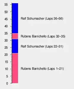 This left Barrichello in the lead with Schumacher's Ferrari, minus a front-wing, in second place and his brother Ralf in third. Michael Schumacher came into the pits for a new nose, promoting Ralf to second. The second lap saw a collision between the two Jordans of Giancarlo Fisichella and Takuma Sato, when the latter ran into the back of the former. "I am really sorry about what happened," said Sato after the race, "I apologized to Giancarlo immediately after the race and he took it very well which I think says a lot of good things about his character" he added.[3] On lap 7, Montoya was given a drive through penalty which cost the Colombian 20 seconds to Barrichello's lead, it was the first drive through penalty in Formula One, as the penalty was added to the list of penalties for the stewards.[3]