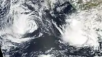 In the eastern Pacific, two simultaneous hurricanes on October 6, Nora (left) and Olaf (right)